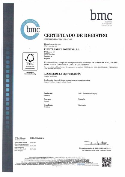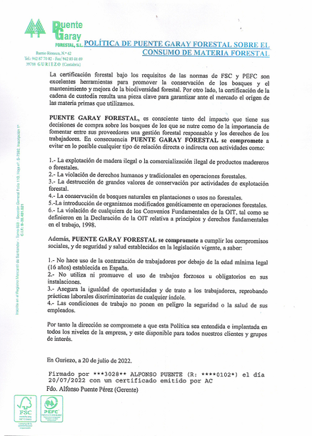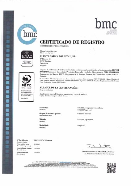 PUENTE GARAY FORESTAL S.L. dispone de un Sistema de cadena de Custodia conforme lo establecido en los documentos PEFC ST 2002:2020 Cadena de Custodia de Productos Forestales y Arboles (Requisitos), y PEFC ST 2001:2020 Reglamento de Marcas PEFC (Requisitos) y el Sistema Español de Certificación Forestal (PEFC España).